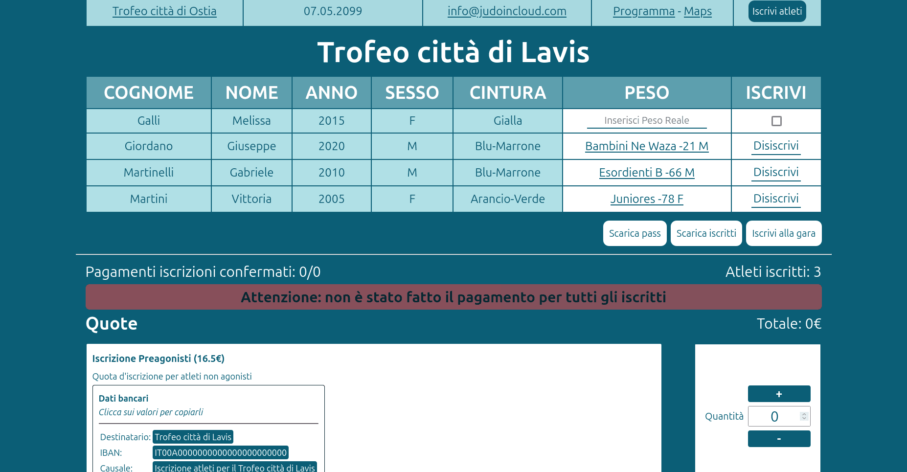 Una volta iscritti gli atleti, potrai caricare il bonifico del pagamento segnando le quote che vuoi pagare. Cliccando sui dati di pagamento, potrai comodamente copiarli ed incollarli nel sito della tua banca. Il pagamento verrà revisionato dall'organizzatore, e riceverai una mail alla sua conferma. Il pagamento non è nominale: potrai ad esempio disiscrivere un atleta e inscriverne un altro al suo posto. I pagamenti verranno ricevuti direttamente dall'organizzatore e Judo in Cloud non ne avrà alcun controllo: eventuali rimborsi vanno concordati con lo staff organizzatore.