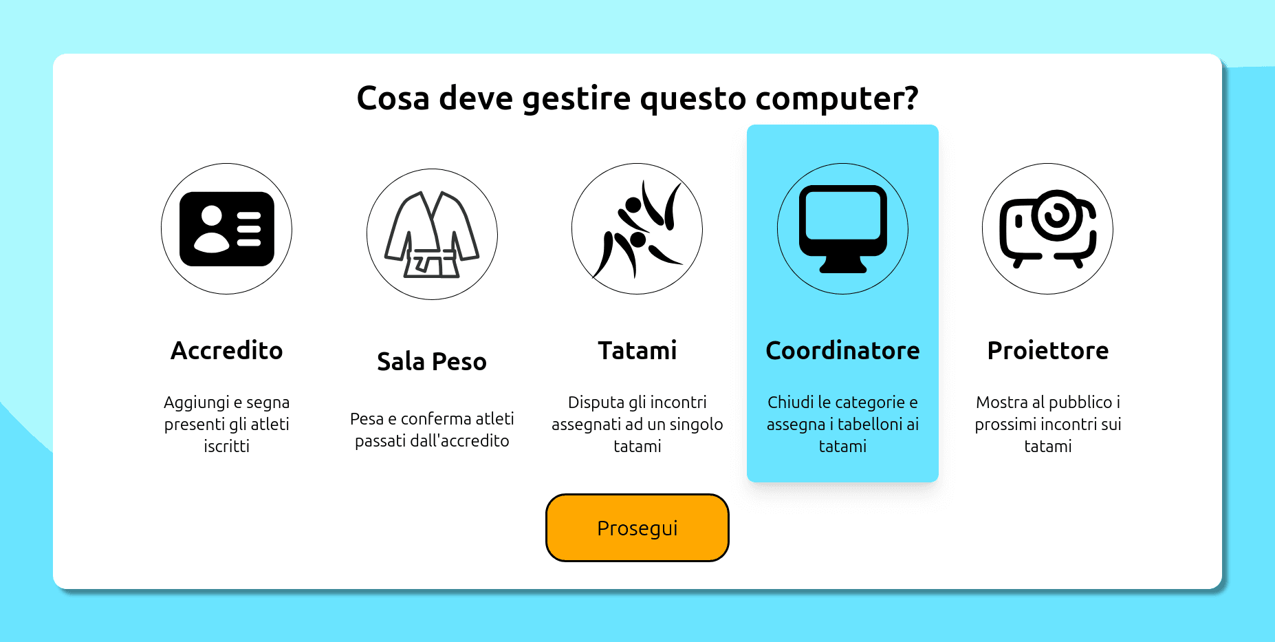 Normalmente, una volta assegnati i tabelloni ai tavoli, ogni tatami è libero di scegliere la categoria e gli incontri da fare. Tuttavia, può essere che il coordinatore voglia decidere l'ordine esatto degli incontri da fare per ogni tavolo. In questo caso, basta cliccare sull'icona colorata in alto a destra di un tatami per scegliere quali incontri fare prima. Si possono trascinare intere categorie o singoli incontri, e si possono trascinare incontri in mezzo ad una categoria (magari per spezzare un girone all'italiana, come d'esempio).