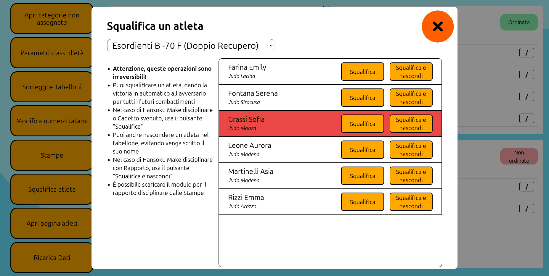 Nel caso in cui sia necessario squalificare un atleta, questo è possibile da questo menù. Seleziona il torneo in alto a sinistra, poi seleziona l'atleta. In tutti gli incontri successivi la vittoria verrà data automaticamente.