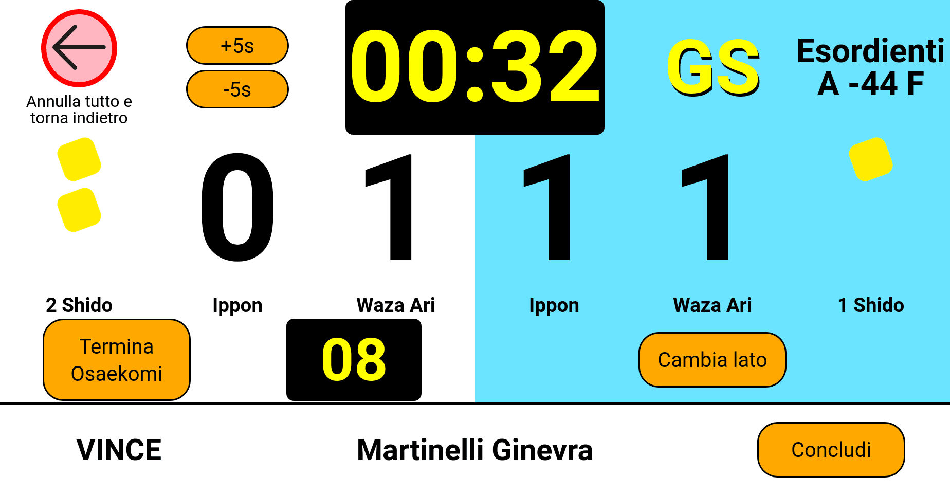 Dalla tabella incontri è possibile anche cliccare su un incontro già finito, per poterne cambiare risultato nel caso si sia dato un punteggio ad un atleta sbagliato o se fosse necessario continuarlo da dove era finito. Verranno mostrati i dati salvati dall'ultima vittoria.